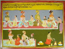 | Description / विवरण | Miniature painting based on Harivansha depicting Yadav king sitting with his son in different pose. On the right side king performing alms to sage and below sage performing yagna. It is incomplete painting. |