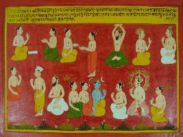 | Description / विवरण | Miniature painting based on Mahabharat - Vana parva depicting Nayak saying that anything that is written in the Veda should be followed like Karma, Dhyan, Satya truthfullness and by doing this anybody gets anna and vastra. While in the painting Ashwani Kumar is seen talking with a Brahman in different posture and some Devtas are seen including Shiv. |