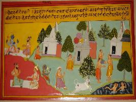 | Description / विवरण | Miniature painting based on Ekadashi Mahatmya depicting importance of Ekadashi vrat in Jeth month depicting a sage telling the importance of 24 Ekadashi vrat performed all over the year. |