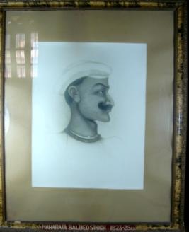 | Description / विवरण | A bust size print of Maharaja Baldev Singh, facing left. It is kept in a glass and wooden frame. |
