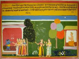 | Description / विवरण | Miniature painting based on Krishna charitra - Sur Sagar depicting Rag Bilawal, Ragini of Rag Hindol depicting childhood activities of Krishna where he is stealing butter from houses. |