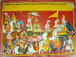 | Description / विवरण | Miniature painting based on Harivansha depicting Kaljavan marching to attack Mathura with his army. |