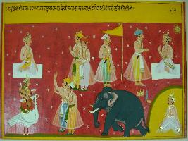 | Description / विवरण | Miniature painting based on Raghuvansha depicting Raja Raghu sitting and his nobles standing near by at top right, at the top left, he is talking to one of noble. Below this he is shown sitting and an elephant is depicted near him. At the lower right, goddess Saraswati is shown sitting over swan and two nobles talking to her. |