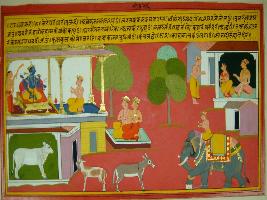 | Description / विवरण | Miniature painting based on Krishna charit - Sur Sagar depicting Rag Dhanashri, Ragini of Rag Shri. On the upper part Vishnu is depicted sitting with Surdas and a couple depicted talking on the lower part various animals are depicted. |