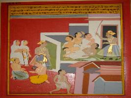 | Description / विवरण | Miniature painting based on Panchtantra depicting at the right part a king entering in a palace with two monks, and below them, 2 noble are seated an talking. On left part the king is depicted beating 5 monks with stick. It is an incomplete painting. |