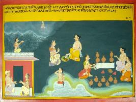 | Description / विवरण | Miniature painting based on Harivansha depicting Narad that to take proper diet, taking bath in the morning and worshipping Vishnu are the signs of a true person. |