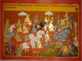 | Description / विवरण | Miniature painting based on Mahabharat - Bhishma parva depicting Kaurava are coming to the battle field Bhishma is leading them. On the another side Pandavas marching forward with Krishna as a charioter. |