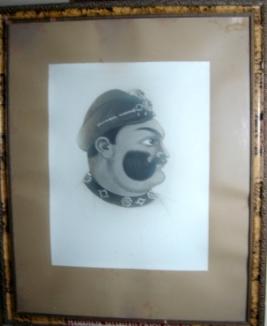 | Description / विवरण | Glass framed black and white photograph of Maharaja Jawahar Singh who ruled from 1763 to 1765. He is facing left and has moustaches. |