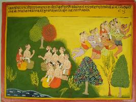 | Description / विवरण | Miniature painting based on Mahabharat - Vana parva depicting Pandavas are discussing asking Ghatotkach to come for their help. Then Ghatotkach are coming with other demons and fly with Pandavas in the sky. |