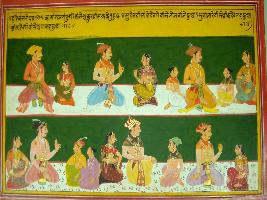 | Description / विवरण | Miniature painting based on Harivansha depicting genealogical decendancy of king Kashiraj, upto Vikradev. It includes kings like Akrura, Vasudev and Vrikdev. The kings are sitting with their wives, sons and daughters in two rows. |