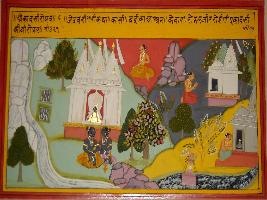 | Description / विवरण | Miniature painting based on Ekadashi Mahatmya depicting Ekadashi of Jeth month. Ti depicts the scene of Kashi where sage Kedar got the boon in hermitage of sage Badri due to Ekadashi vrat. |