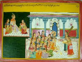 | Description / विवरण | Miniature painting based on Harivansha depicting Vasudev sitting with twelve females in his court and a daughter of Balikari, Rohini is also present in the court. |