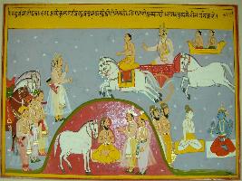 | Description / विवरण | Miniature painting based on Raghuvansha depicting a king standing with his companions along with horses and Indra is coming on the chariot. In left below Vishnu and Shiv are talking to each other, in the bottom a rishi is seated and a horse is standing near him, two men are standing with folded hands. |