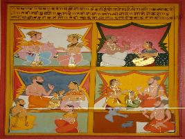 | Description / विवरण | Miniature painting based on Panchtantra depicting one day a sage brought a girl to his home then his wife ask who is she and express her wish to adopt her as their daughter. |