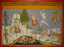 | Description / विवरण | Miniature painting based on Mahabharat - Vana parva depicting Bhim is depicted fighting with demons which is his duty. Bhim is also depicted plucking the lotus flower from the water, Bhim is depicted again fighting with arrow with demons. |
