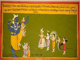 | Description / विवरण | Miniature painting based on Ekadashi Mahatmya depicting Ekadashi of Asad month depicting Krishna telling about his Vamana incarnation and massive Trivikram roop to Yudhisthir. |