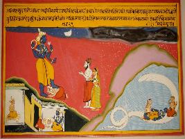 | Description / विवरण | Miniature painting based on Ekadashi Mahatmya depicting Ekadashi vrat of Asad month. It depicted Krishna telling about his Vamana incarnation and Trivikram roop to Yudhisthir and how he defeated demo king Bali. |