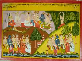 | Description / विवरण | Miniature painting based on Mahabharat - Vana parva. The painting depicts that Pandavas are walking in the bank of the river Saraswati and Yamuna and they entered in the Kamyaka vana where they get to see that many sages are worshipping their. |