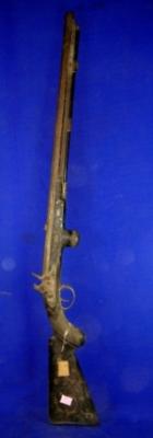 | Description / विवरण | Foreign made single barrel muzzle loading gun with flint lock, metal barrel and trigger having incised vine design. The wooden butt has floral inlay work and incised check design. |