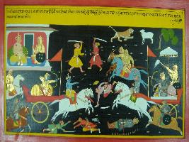 | Description / विवरण | Miniature painting based on Mahabharat - Bhishma parva depicting a fighting seen of Kauravas and Pandavas where Bhishma is fighting very bravely. Arjun also is seen fighting with Bhishma and both of them are compared as a tiger and a cow where Bhishma is comparing with a tiger. |