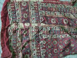 | Description / विवरण | It is a maroon colored floor cloth with geometrical pattern used on it with floral designs. The central portion is badly damaged, floral and architectural designs are used on it. It is locally called jajam, floral pattern on brick red ground with border. |