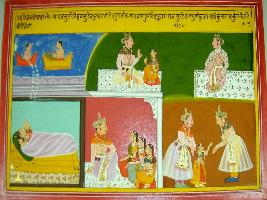 | Description / विवरण | Miniature painting based on Harivansha depicting scene at the top two celestial rishi s are on the magic mat. queen lying along her daughter in the right below, in middle below king is talking with his daughters. In left below a daughter is shown between two king. |