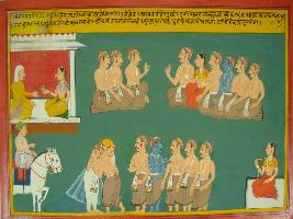 | Description / विवरण | Miniature painting based on Mahabharat - Vana parva. The painting depicts that Pandavas are welcoming Vidur and asking about Hastinapur. |