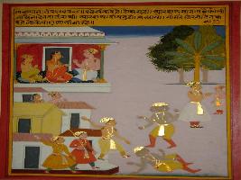| Description / विवरण | Miniature painting based on Panchtantra depicting at the upper left, a female asking her husband to ask four arms and three heads from the Devta . Below them the scene depicted the man coming out from his house and asked Devta four arms and three heads. The Devta gave this boon and when the man returned with three heads and four arms the villagers killed him by thinking him as a demon which is depicted at the lower part of the painting. |
