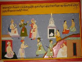 | Description / विवरण | Miniature painting based on Ekadashi Mahatmya depicting Ekadashi vrat in Shravan month depicting talking to his minister that wealth gained with bad source and wealth gained by snatching from a Brahman is worthless. |