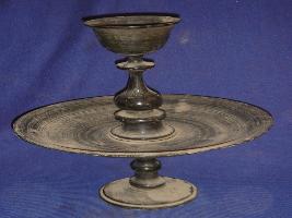 | Description / विवरण | Metallic Ittardan, having footed circular base, a broad dish in centre and a shallow round bowl with broad mouth on top to place the candle. |