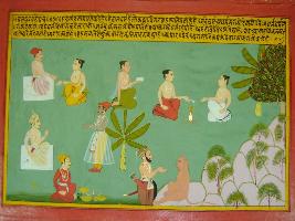 | Description / विवरण | Miniature painting based on Mahabharat - Vana parva. This painting depicts Hanuman in monkey form talking to Bhim at the lower left part. At the upper right part a man is shown with Brahman to their left, one sage is shown reading shastra. At the extreme left, two sages are shown performing yagna. At the middle right part, king is shown sitting with another man standing with folding hand. At the lower right part, man is shown with weight balance. |