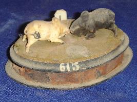 | Description / विवरण | Two small ivory humped bulls in fighting position on a black coloured oval wooden platform. One bull is black and one is white. |