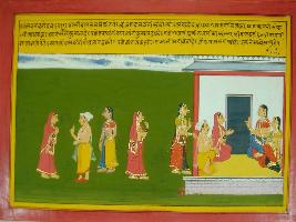 | Description / विवरण | Miniature painting based on Mahabharat - Vana parva. The painting depicts Damayanti and Nal, who is in quise of a servant of the king,is taking each other while the daughter of the king informing about the matter to her mother and it returned that queen wanted to talk with Nal and Damayanti. |