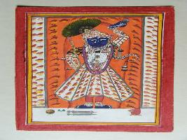 | Description / विवरण | It is a painting of Srinathji shown with uplifted arm, flute, feathered cap, red costume in a fortified place decorated with yellow. |