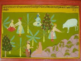 | Description / विवरण | Miniature painting based on Mahabharat - Vana parva. This painting depicts Hanuman in monkey form is sitting on mountain and talking to Bhim at the lower left part. At the upper middle part, Krishna is shown and at the upper left part, a man is shown giving grass to cow. At the upper right, Brahman is shown sitting with man standing near him. |