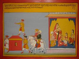 | Description / विवरण | Miniature painting based on Mahabharat - Vana parva depicting departure of Damayanti from her howe depicts the beauty of Damayanti. |