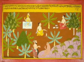 | Description / विवरण | Miniature painting based on Mahabharat - Vana parva. This painting depicts the conversation of Hanuman and Bhim. Bhim asked how Parameswara maintained dharma in the creation. |