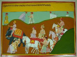 | Description / विवरण | Miniature painting based on Raghuvansha. A king is depicted marching, he is on a chariot, along with an elephant rider and three horsemen. Two people are bowing down before the king. |