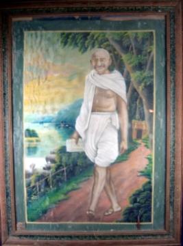 | Description / विवरण | Full size portrait of Mahatma Gandhi in walking position holding a book in right hand. It is framed with glass. |