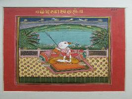 | Description / विवरण | It is a painting of Chhanda Shastra Swarupa, in which bird face god is shown in padmasana holding a spear and long garland sited in a fortified area background of mountain, trees and birds. |