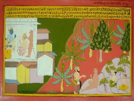 | Description / विवरण | Miniature painting based on Mahabharat - Vana parva. This painting depicts Bhim and Hanuman where Hanuman is telling the story of Ram that he killed Ravan and set up Vibhishan on the throne. Then he came back to Ayodhya and finally he went to heaven. |