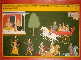 | Description / विवरण | Miniature painting based on Mahabharat - Bhishma parva depicting Bhishma after defeating the king of Baranase brought his three daughter-Amba, Ambika and Ambalika. After that he fought with Parasurama Sanjay narrating this story to Dhritrashtra. |