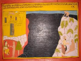 | Description / विवरण | Miniature painting based on Mahabharat - Vana parva depicting Hanuman telling Bhim that how he reached Lanka by the order of Ram and there he met Sita. |