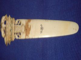 | Description / विवरण | Ivory knife with blunt edges and slightly pointed ends. On top-there are two peacocks with same design in middle. On top of them there is a pedestal of floral designs. On it, an elephant is fighting with a camel. |