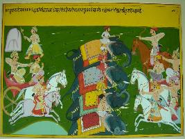 | Description / विवरण | Miniature painting based on Raghuvansha. This is a depiction of war scene between a king and the king Raghu of Kalinga. The kings are sitting in chariots and elephants and horsemen are attacking each other. |