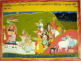 | Description / विवरण | Miniature painting based on Harivansha depicting Sahastrajuna sitting on a throne, in front of whom, king of Swaphadipa, king of Sarvaratan and king Pasupal is sitting. Behind them their attendants with horses, elephant and gifts are depicted. At the left upper part rain with clouds and lightening is seen and at the left lower part cows are seen. |