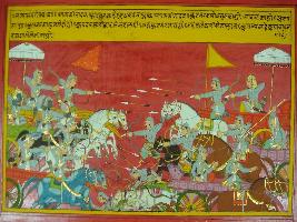 | Description / विवरण | Miniature painting based on Mahabharat - Shalya parva depicting the fight between Satyaki and Kritverma. Satyaki is with the bow of Kritverma and killed his chariots. After that Kritverma start throwing trident but at that time arrow of Satyaki pierced the chest of Kritverma and he fell down on the ground. |