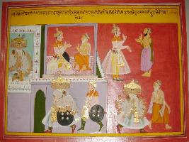 | Description / विवरण | Miniature painting based on Harivansha depicting at the lower part Raja Sahastrajuna make Ravan, a prisoner. At the lower right corner prisoner Ravan is seen. Next to is Saptarishi is seen talking to Sahastrajuna and freed Ravan that is depicted at the lower left part. |