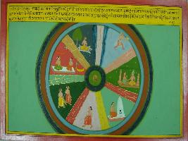 | Description / विवरण | Miniature painting based on Mahabharat - Bhishma parva depicting different parbatas like MalyaParvat, Jaladhar Parvat, Ravat Parvat in a circle.Inside the circle some scenes related to major events of human life is depicted. |