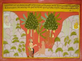 | Description / विवरण | Miniature painting based on Mahabharat - Vana parva. This painting depicts the conversation between Hanuman and Bhim. Where Hanuman is giving his real introduction to Bhim. |